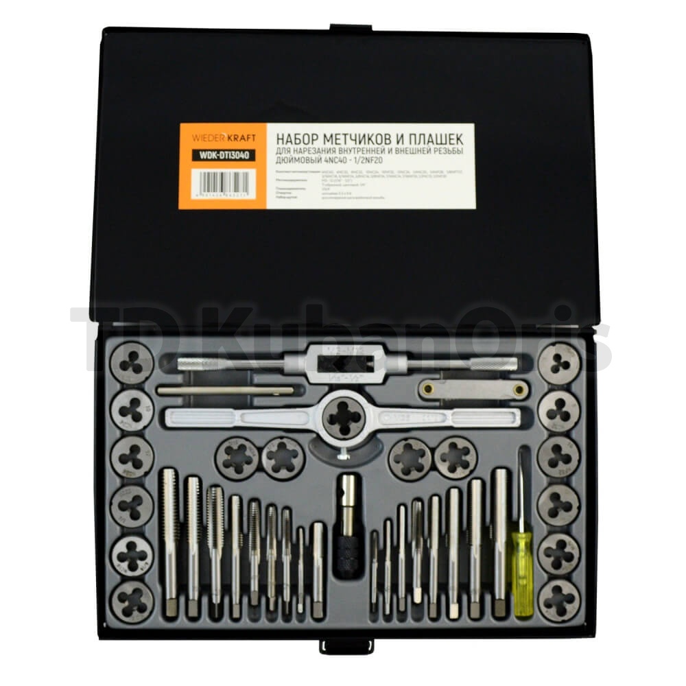 Плашки: 4NC40, 6NC32, 8NC32, 10NC24, 10NF32, 12NC24, 1/4NC20, 1/4NF28, 1/8NPT27, 5/16NC18, 5/16NF24, 3/8NC16, 3/8NF24, 7/16NC14, 7/16NF20, 1/2NC13, 1/2NF20 – 17 шт.